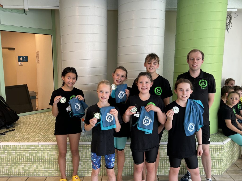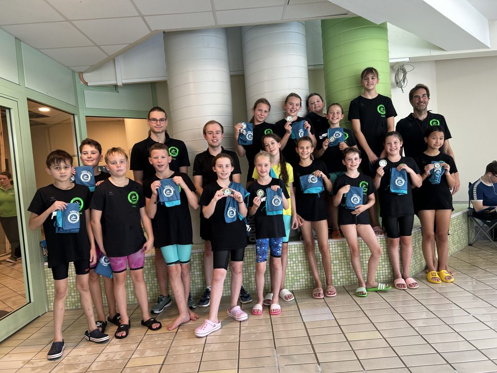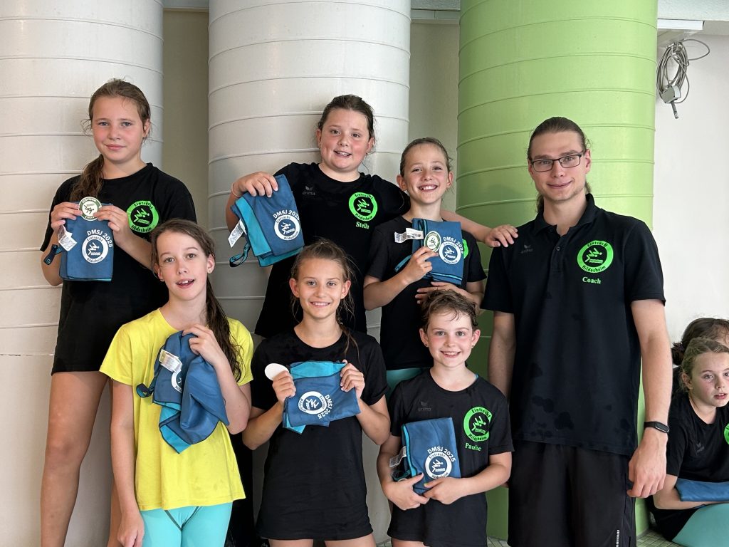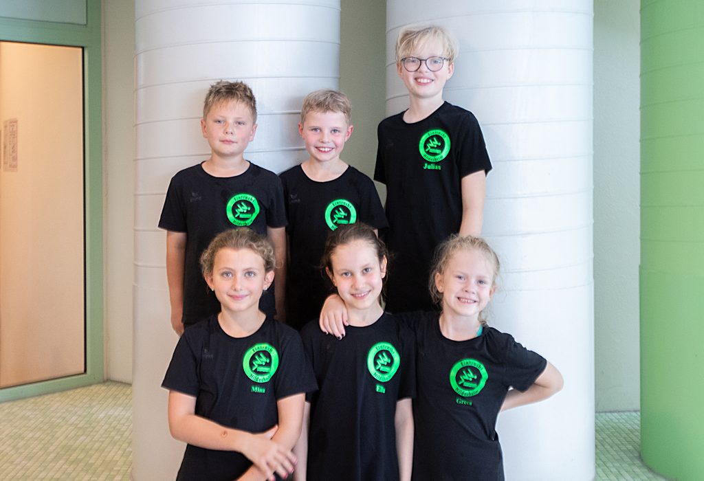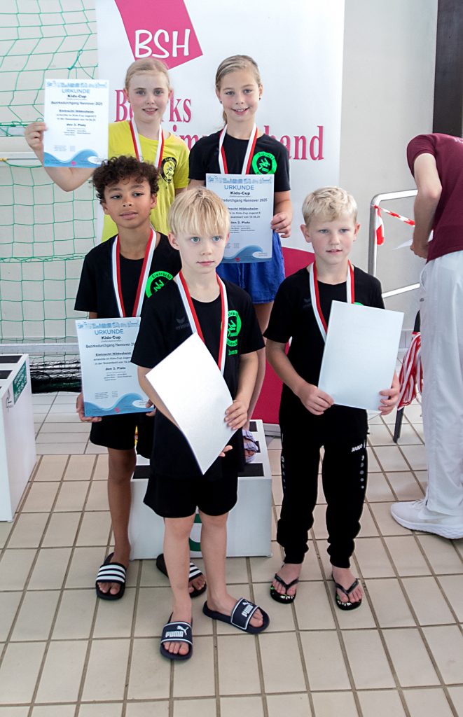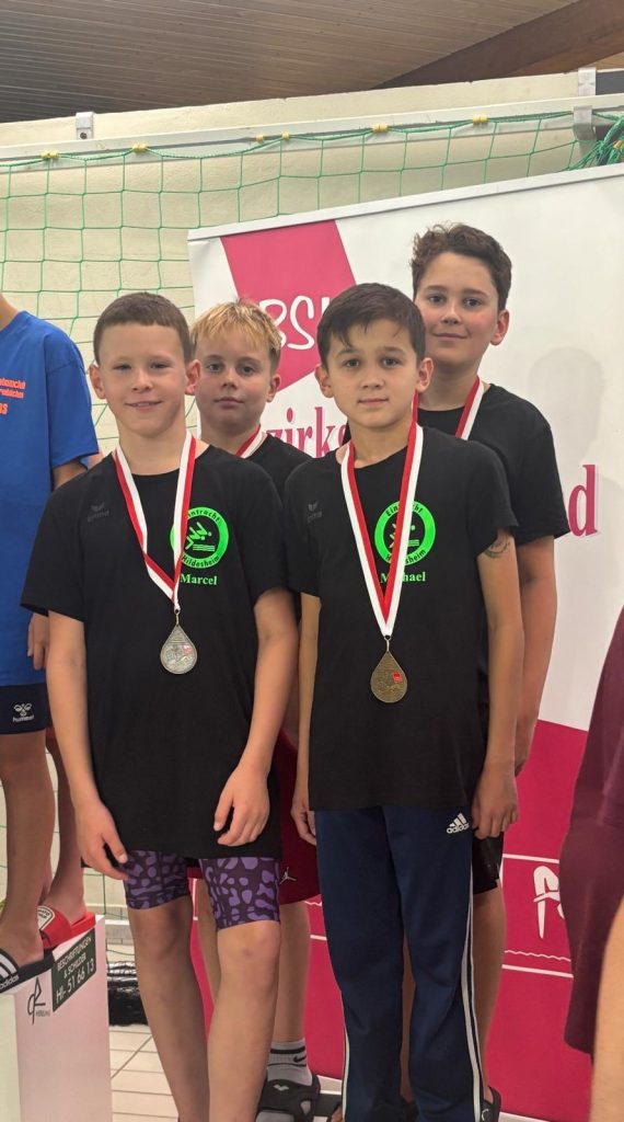 Das Wasserparadies Hildesheim war am 20./21.09.2025 Schauplatz des diesjährigen deutschen Mannschaftsschwimmen der Jugend (DMSJ) auf Bezirksebene, welches wie die Kreismeisterschaften zwei Wochen zuvor wieder die Schwimmabteilung von Eintracht Hildesheim ausgerichtet hat. Wir selbst haben dazu sieben Staffelteams bei diesem Wettkampf antreten lassen, davon drei in der Jugend D (2014 und 2015), zwei in der Jugend E (2016 und 2017) und zwei in der Jugend F (2018 und 2019). Die Teams der Jugend E und F starteten am Samstagvormittag und wurden dort von Jacqueline Schlenk, Angelique Klein, Gesa Grove und Tobias Falk betreut. Unser jüngster Nachwuchs aus der Jugend F trat dabei in den Kategorien 4×25 Meter Freistil, 4×25 Meter Rücken und 4×25 Meter Kraulbeine an. Die erste Mannschaft dieser Jugend mit Max Malkow (2018), Pauline Elisa Dressler (2018), Yelizaveta Verovkina (2018), Keanu Hesse (2018)und Fynn Coldewei (2018) sicherte sich dabei den zweiten Platz auf Bezirksebene. Dieselbe Bilanz hat unsere Mannschaft der Jugend F im vergangenen Jahr schon auf Bezirks- und Landesebene erzielt. Unsere beiden Teams der Jugend E traten in den Wettrennen über 4×50 Meter Freistil, Rücken, Brust und Lagen an. In einem spektakulären Rennen sicherte sich die zweite Mannschaft, bestehend aus Noah Benz (2017), Ella Marie Abu-Fares (2016), Julian Felix Dressler (2017), Greta Sophie Bodensieck (2017), Lukas Benjamin Buschermöhle (2017) und Mina Hamann (2016), den achten Platz. Die Schwimmerinnen und Schwimmer der ersten Mannschaft erkämpften sich sogar einen Platz auf dem Podium: Elise Blohm (2016), Johanna Walter (2016), Jannes Wirth (2016), Samuel Khadhraoui (2016) und Tamme Kortum (2017) konnten je eine Bronzemedaille mit nach Hause nehmen.