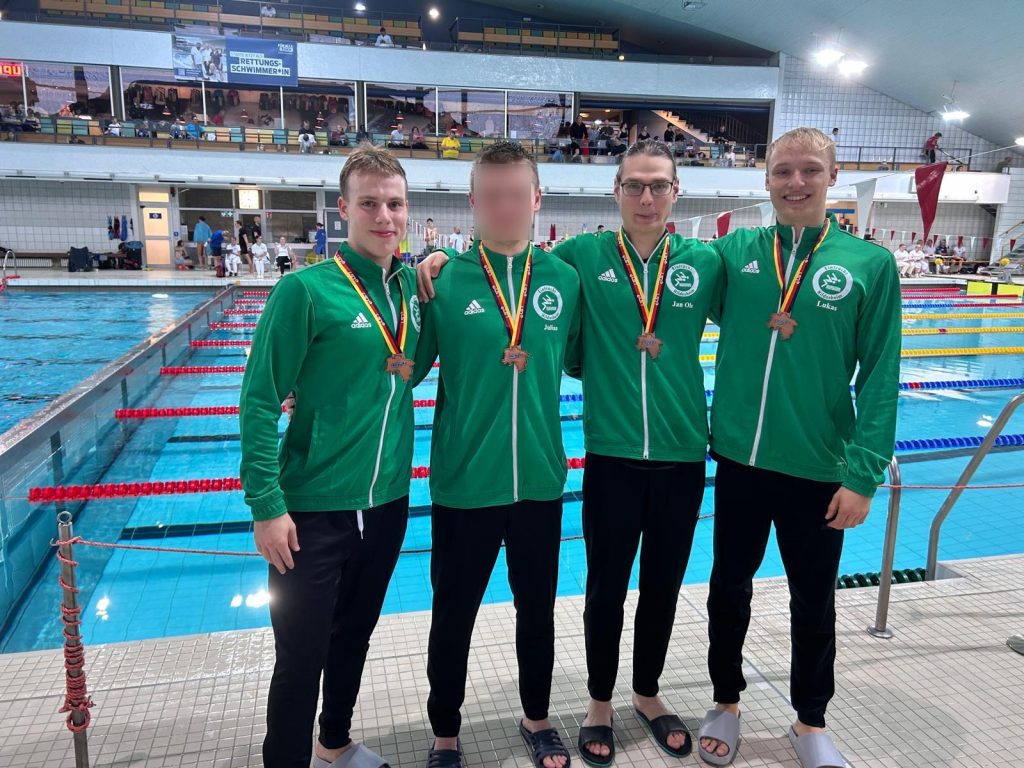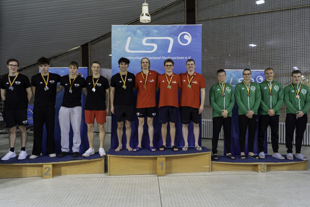 Doch nicht nur die Einzelstarts bescherten unseren Jungs eine Vielzahl an Medaillen. In der 4×50 Freistil Staffel feierte Jan Ole Englmann, aktueller Co-Trainer im Orca-Team, sein Comeback. Nach jahrelanger Pause bedingt durch Long Covid und einigen Verletzungen ging er nun zusammen mit Lukas Stöcklein, Tim Oberbeck und Julian Alexander Ackemann an den Start: Lediglich die beiden Teams der W98 Hannover konnten unserem Team die Stirn bieten. Mit ihrem dritten Platz auf Landesebene stellten die Jungs zudem einen neuen Kreisrekord auf, den es nun wieder zu schlagen gilt. Herzlichen Glückwunsch!!!